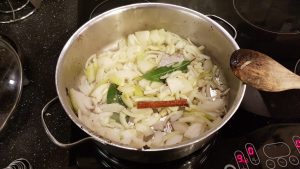 - Heat the olive oil in the sautee pan with the bay leaves and cinnamon stick.