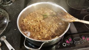 - Add the beef mince and cook until browned.